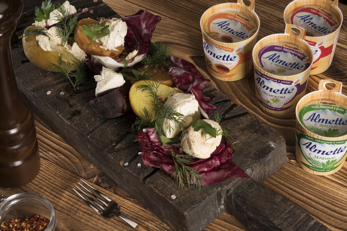 2. Когда овощи будут готовы, разрежьте их пополам и красиво выложите на сервировочную доску. Отделите несколько листьев радиккьо и разместите их рядом с овощами. На картошку положите сыр «Альметте» с белыми грибами, на репу — сыр с зеленью, на свеклу — сыр с чесноком, а на радиккьо — сыр с томатами.