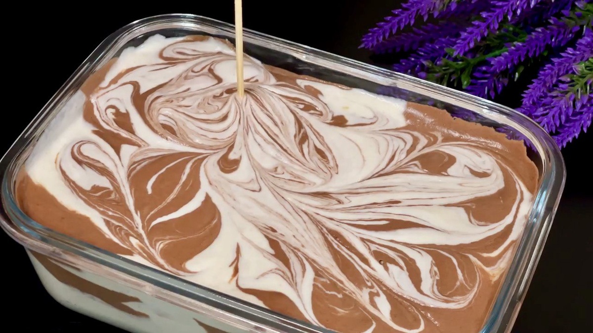6. Заморозьте мороженое. В форму кладите белую и шоколадную массу поочередно, чередуя их. Легонько потрясите форму, чтобы составы перемешались немного, затем с помощью деревянной шпажки создайте узоры на поверхности. Закройте форму пленкой или крышкой и поставьте в морозильник минимум на 6-8 часов.