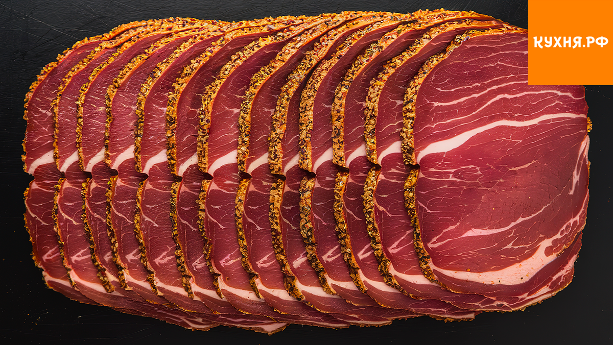 - Бастурма: вяленая говядина с острым и пикантным вкусом, дополненная ярким ароматом пажитника.