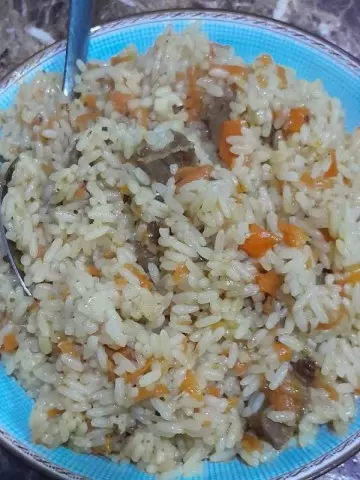Пока мясо готовится, рис нужно тщательно промыть до прозрачности. После приготовления зирвака, проверить бульон — он должен покрывать мясо на 1.5-2 см. Затем увеличить огонь и аккуратно уложить рис горками, не перемешивая, чтобы сохранить их целостность. В конце добавить головки чеснока и залить рис горячей водой через шумовку. Как только вода исчезнет, собрать рис в горку и накалить её в нескольких местах для выхода пара. Накрыть казан крышкой и оставить на минимальном огне на 25-30 минут.