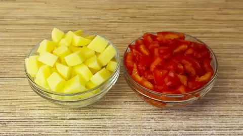 В глубокой миске перемешивают картофель с 1 ч. ложкой хмели-сунели, 1 ст. ложкой растительного масла, солью и перцем по вкусу. Также добавляется 0.5 ч. ложки молотой паприки для цвета и аромата. Для большей насыщенности можно добавить нарезанные кружочками колбаски и кубики помидоров, предварительно удалив мякоть, чтобы избежать излишней водянистости.