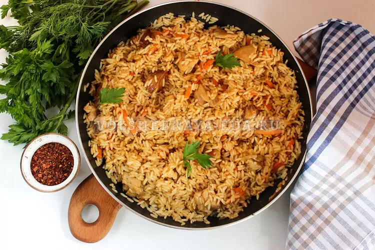 Когда время истечет, проверяют готовность риса. Если нужно - доводят до готовности под крышкой. После этого перемешивают и оставляют под крышкой на 20 минут, чтобы рис впитал последние ароматы. Подавать горячим, наслаждаясь насыщенным вкусом!