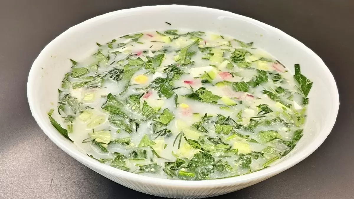 - Овощная часть включает свежие огурцы, редис, зелёный лук и зелень, что делает блюдо богатым клетчаткой.