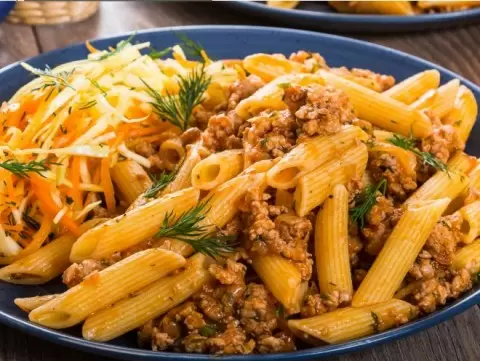 Шаг 7 (Сервировка): Разложить пенне по тарелкам, украсить веточками укропа и подать с витаминным салатом.