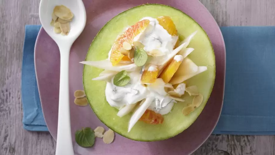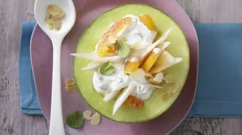 Смешиваем йогурт, грушевый сок и кардамон, добавляем нарезанные мяту, апельсины и груши. Готовую смесь аккуратно помещаем в половинки дынь и перед подачей посыпаем обжаренными миндальными хлопьями. Это блюдо не только радует глаз, но и восхитительно пахнет, даря неповторимые ощущения лета.