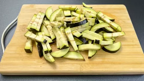 Приступим к приготовлению: нарежьте баклажаны тонкой соломкой, а сладкий перец — аналогично. Овощи поместите в миску, добавьте оливковое масло и посолите. Тщательно перемешайте и отправьте в разогретую до 180 градусов духовку на 15-20 минут. Баклажаны благодаря маслу отлично сохранят свою сочность.
