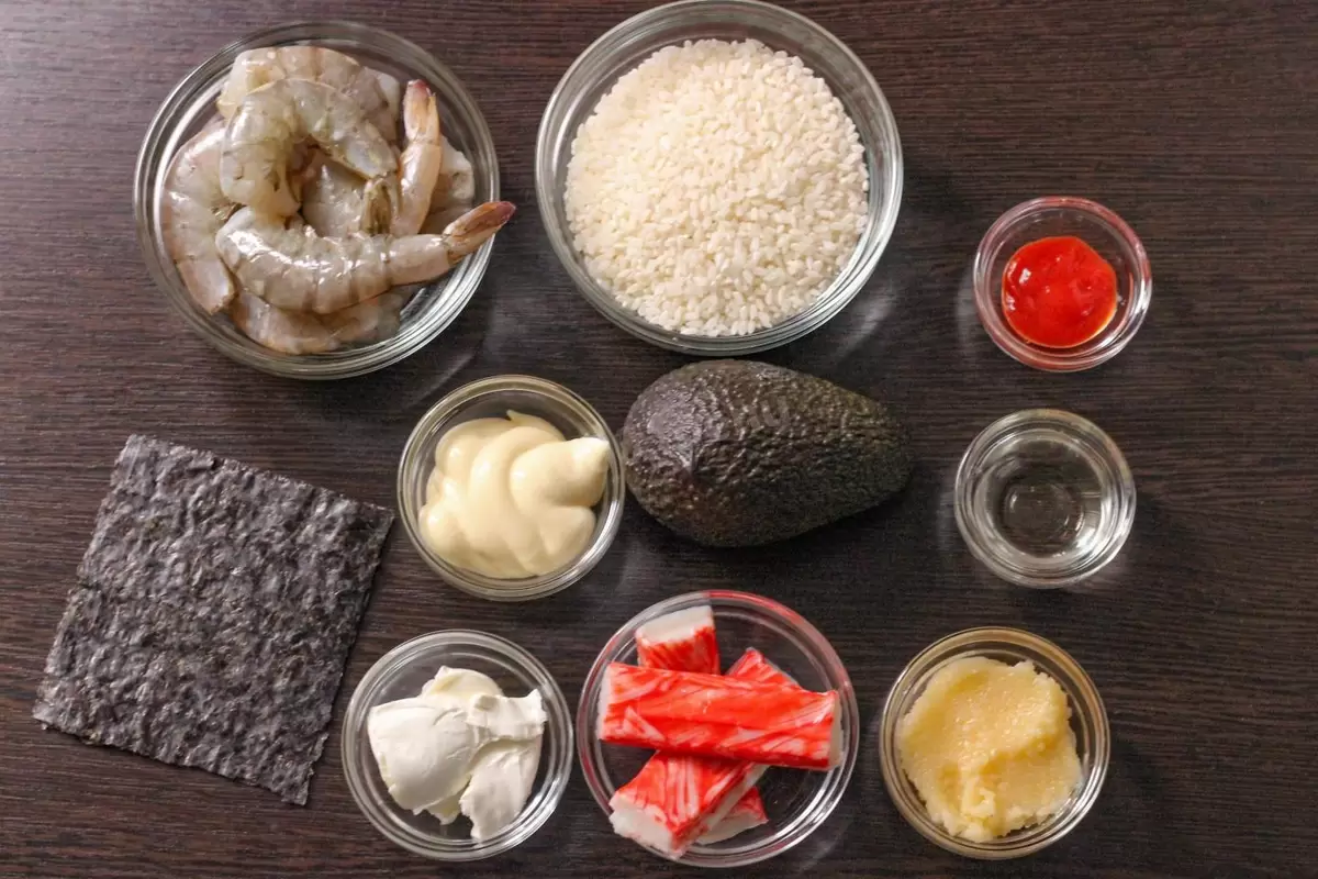 - Начинка: 1 авокадо, 60 г крабовых палочек, 250 г креветок (можно использовать варено-мороженые), 35 г икры мойвы, 45 г майонеза, 3 г соуса шрирача, 30 г творожного сыра.