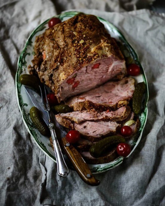 Затем мясо следует достать из рассола и обсушить с помощью кухонного полотенца. С помощью острого ножа сделать небольшие надрезы в мясе и начинить их кусочками чеснока и моркови. После этого обмазать мясо пряной пастой со всех сторон, завернуть в фольгу и запекать в предварительно разогретой до 180 градусов Цельсия духовке в течение 3 часов.