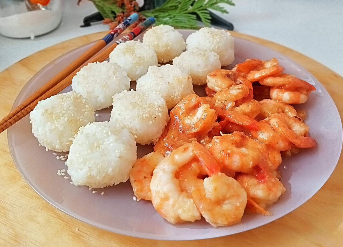 Когда все будет готово, выложите креветки и рисовые шарики на одно большое блюдо. Наслаждайтесь вкусом и атмосферой Японии у себя дома!