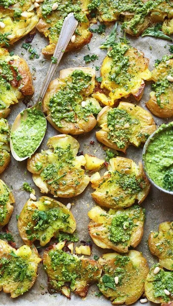 Когда картофель готов, достаем его из духовки и добавляем свежемолотый перец и паприку, а затем щедро поливаем зелёным соусом перед подачей на стол.