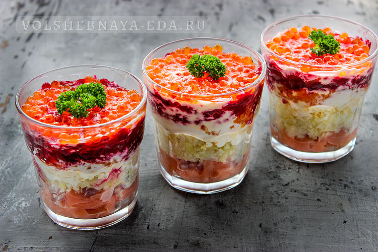 Украшается блюдо красной икрой и должно настояться в холодильнике в течение 3-4 часов для лучшего пропитывания. Подается «Царская шуба» в индивидуальных стаканах и выглядит очень эффектно, что непременно впечатлит гостей.