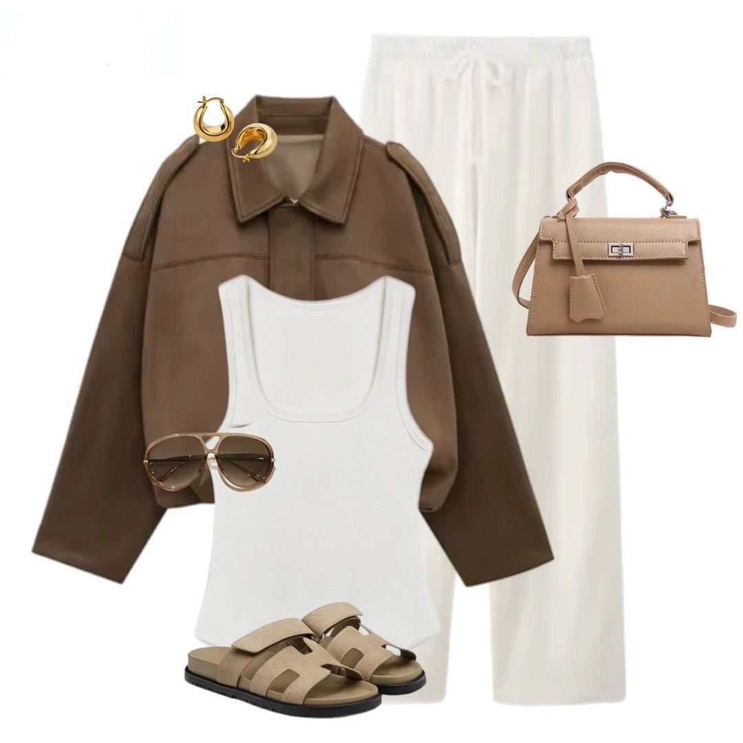 - Шоколадная куртка-рубашка: Укороченный оверсайз с отложным воротником и свободной линией плеча. Такой верх добавляет графичности и помогает сбалансировать светлый низ.