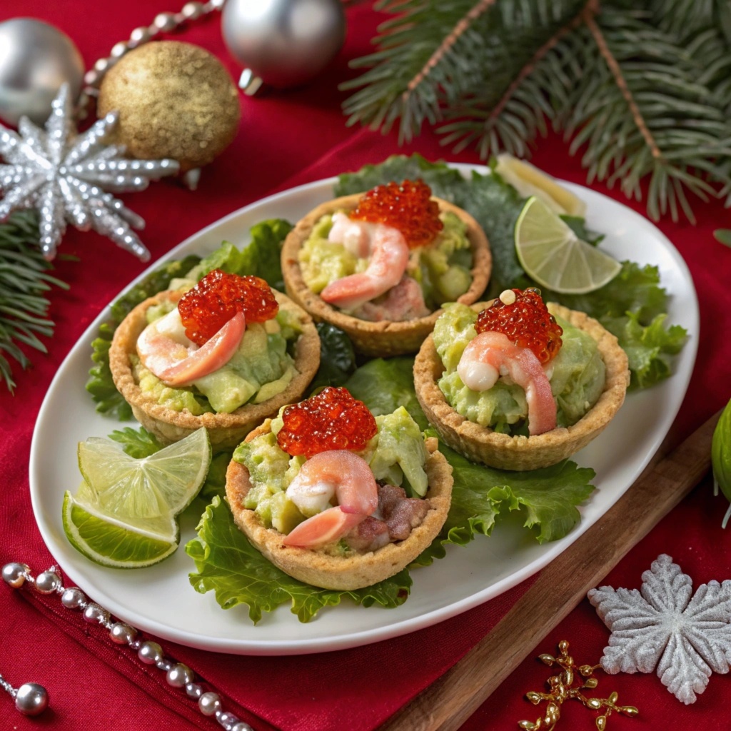 Приготовление: Отварите креветки в подсоленной воде с лавровым листом и охлаждайте. Очистите и нарежьте авокадо, сбрызните соком лайма. Смешайте все ингредиенты и разложите по тарталеткам, украсив красной икрой.
