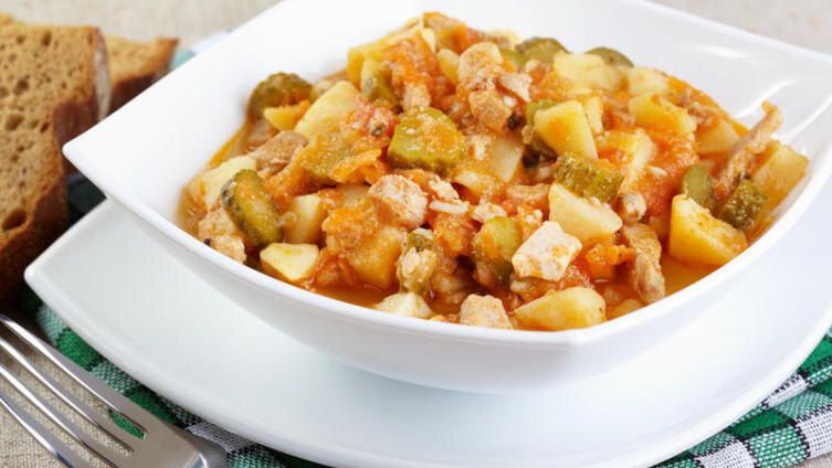 3. **Тушение овощей**. К готовому мясу добавляют помидоры, приправляют солью и перцем. Заливают бульоном, добавляют нарезанный картофель и готовят не менее 10 минут.
