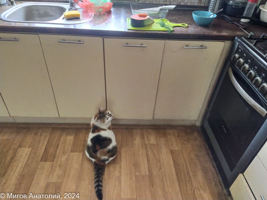Как только рыба оказывается на столе, в дом начинают подтягиваться домашние питомцы. Первая на запах пришла кошка Мамаша Че, за ней потянулась её дочка Кокошка и верный друг – собака Тильда. Процесс разделки требует острого ножа и надёжной ёмкости. Хребет и кости удаляются, а куски кижуча готовятся к засолке.