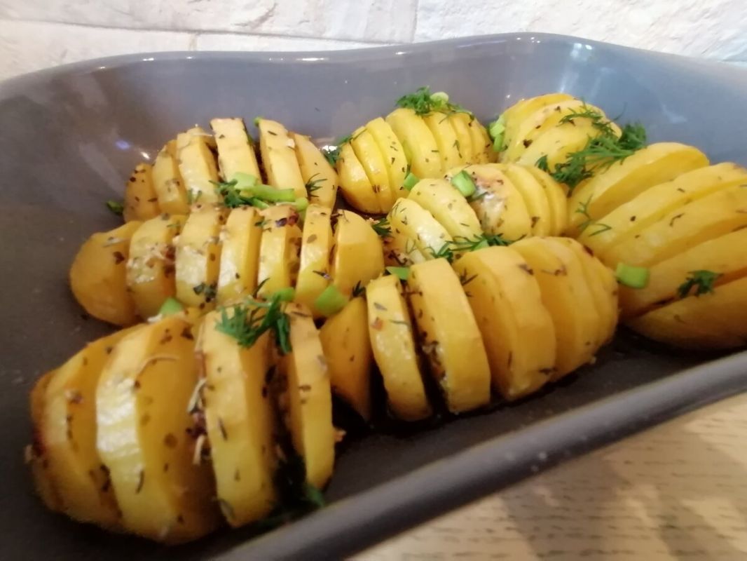 Первым шагом очистить картофель от кожуры. Далее нужно сделать аккуратные надрезы поперек, оставляя возвращение картошки «гармошкой», не срезая до конца. Для удобства можно воспользоваться палочкой для суши.