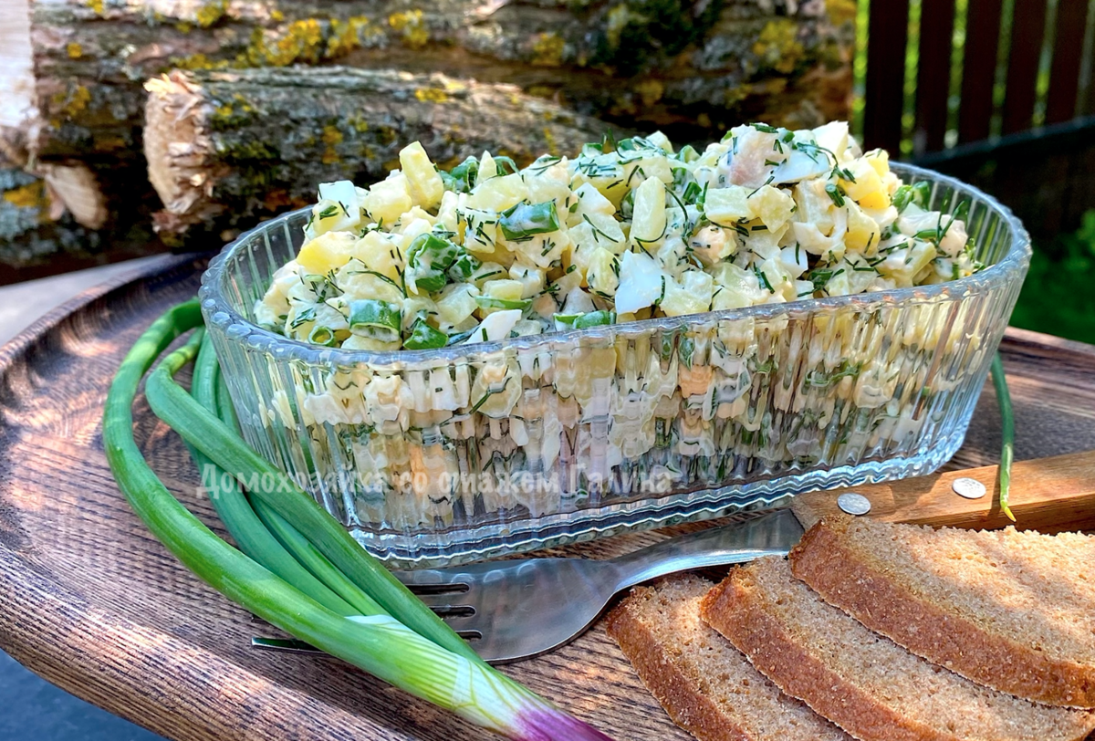 Такой салат можно также готовить с соленой скумбрией, результат получится не менее вкусным. После этого в салат добавляются свежие нарезанные укроп и зеленый лук – чем их больше, тем ярче вкус. Затем пора заправить блюдо: можно использовать майонез и столовую горчицу или же растительное масло для более лёгкого варианта.