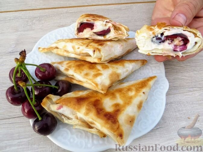Не обойтись и без треугольничков из лаваша с творогом, бананом и вишней. Это простое и вкусное угощение порадует вас хрустящей корочкой и нежной начинкой с легкой кислинкой вишни, позволяя насладиться каждым кусочком.