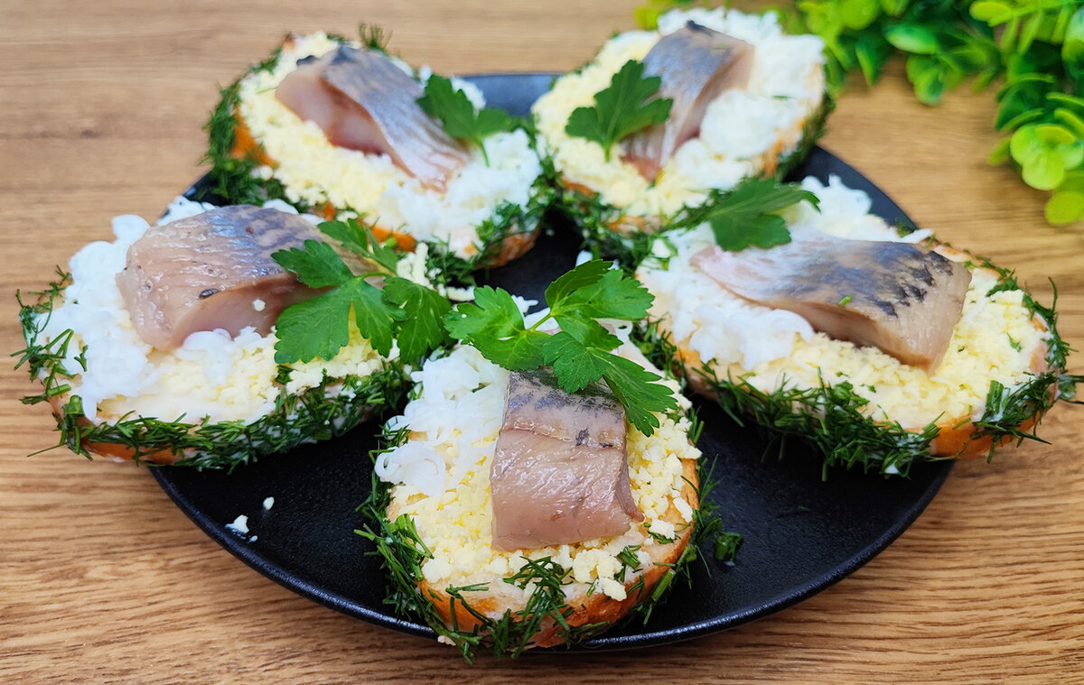 Укроп мельчится и используется для украшения: края бутербродов обмачиваются в зелени, создавая эффект декора. На одну сторону выкладывается тёртый белок, на другую — желток, после чего верх украшается кусочком сельди и листиком петрушки. Ароматные и нарядные, они мгновенно становятся любимыми угощениями на столе.