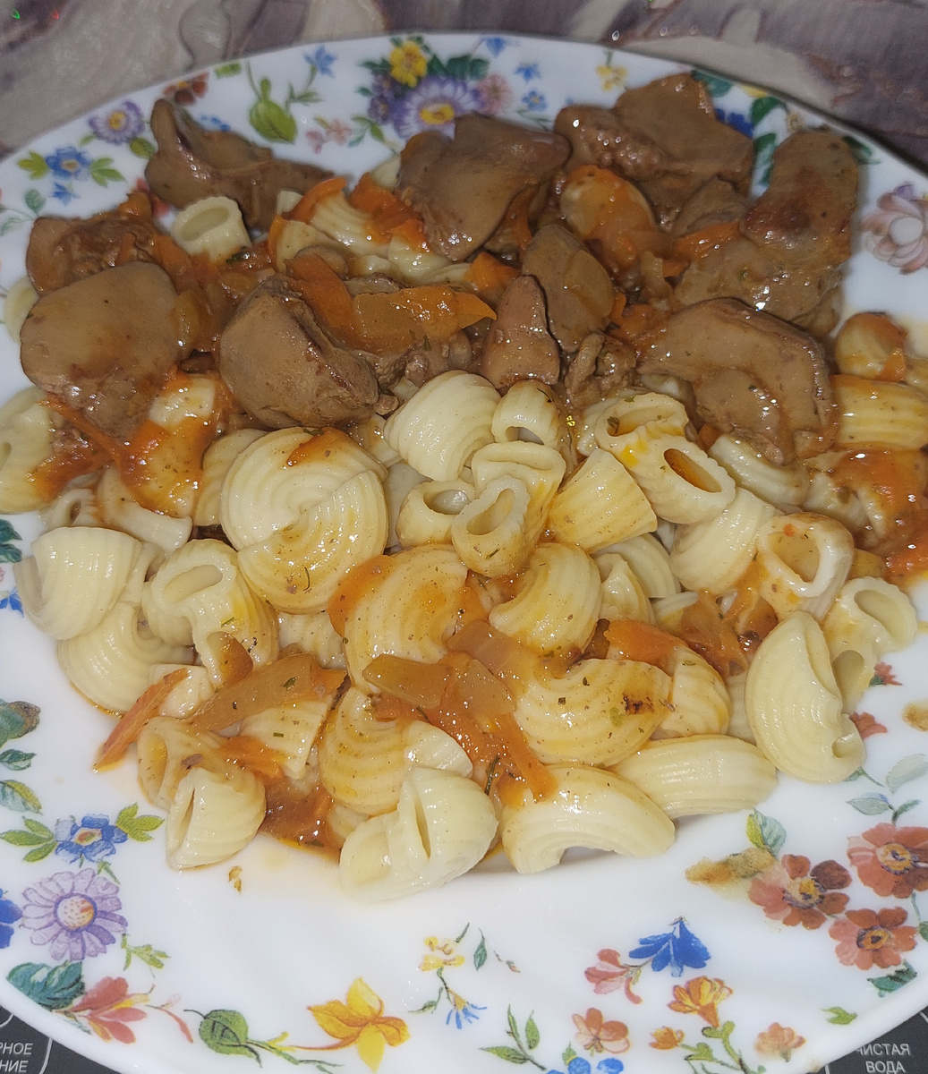 Приготовление началось с нарезки печени на небольшие кусочки и их обжаривания. После этого на той же сковородке был обжарен лук и морковь, добавлено немного муки и томатной пасты, что дало хороший основу для густоты соуса. Затем полученной массой залили печень, разведя до нужной консистенции.