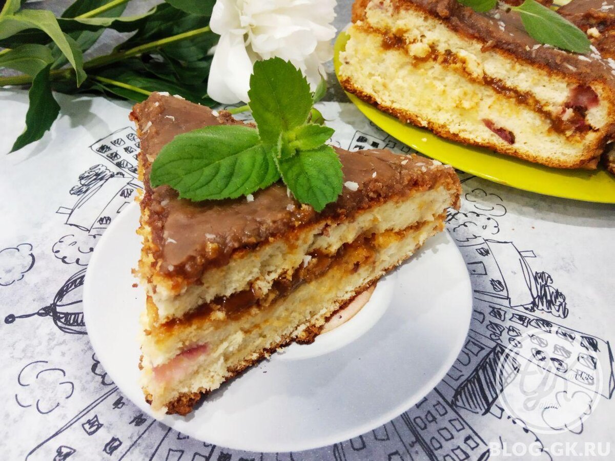 Нежный бисквитный пирог с ягодами под шоколадной глазурью