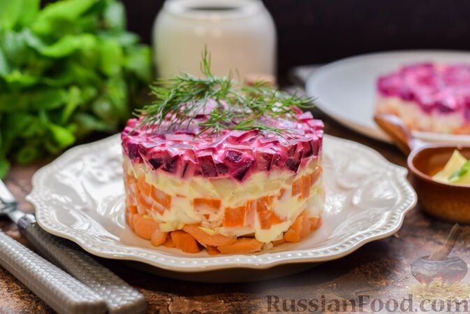 Заключительный аккорд — перевернуть салат на плоскую тарелку, снять пленку и украсить тертым сыром, свежей петрушкой и ягодами клюквы для яркости.