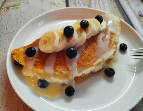 5. На готовую сторону положить начинку, аккуратно сложить блин пополам. По желанию, его можно украсить сгущенкой для сладкого варианта. Овсяноблин получается сытным и даст достаточно энергии до следующего приема пищи.