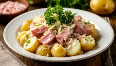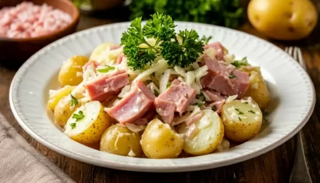 Этот картофельный салат с копченостями может стать как прекрасной закуской, так и лёгким ужином, гармонично сочетая вкус и пользу.