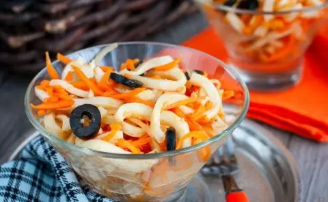 Ищете идеальный салат на каждый день? Попробуйте этот простой и быстрый вариант с кальмарами, морковью и луком. Всего несколько ингредиентов и пара специй - и ваш обед готов!